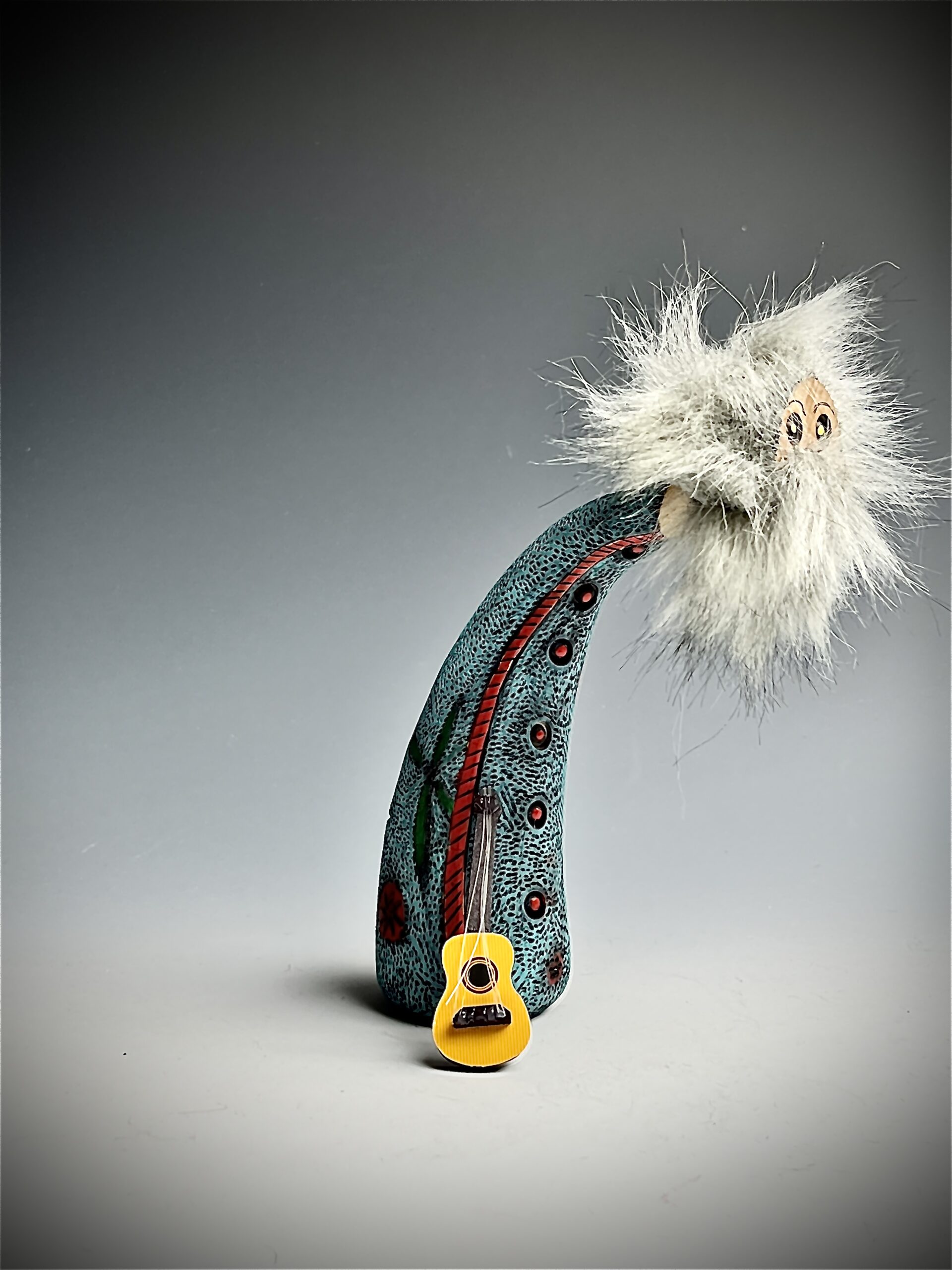 Standing 6 inches tall this was turned, cut apart, reassembled, woodburned and dry brush painted.